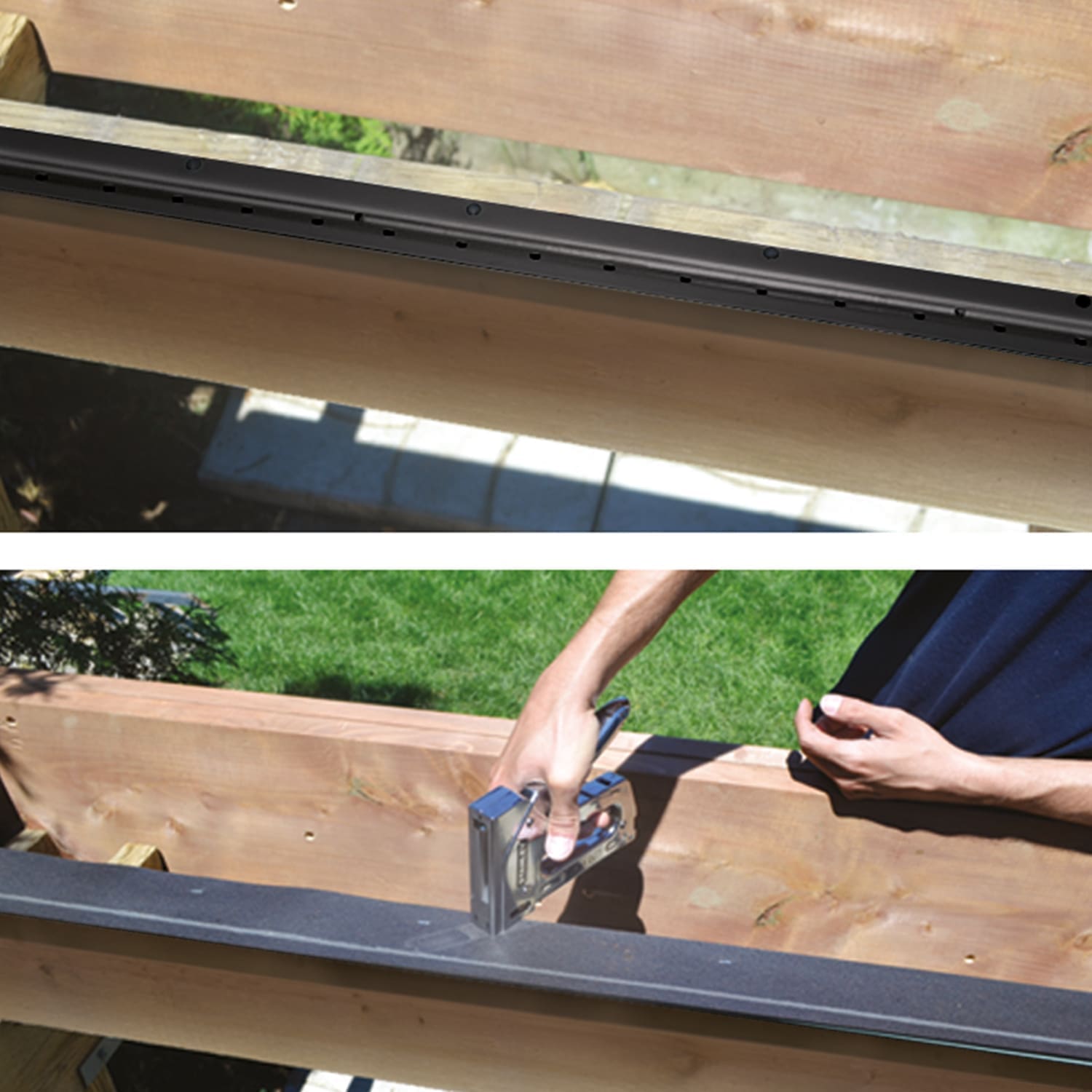 Il suffit de clouer les bandes de fixation à la charpente et de visser celles-ci aux planches du patio (trois vis par planche). Les vis et les clous sont inclus dans l’ensemble de bandes de fixation. Notre vidéo d’installation vous guidera dans l’installation de ce produit.