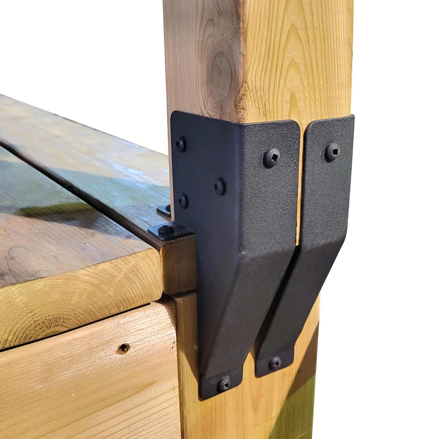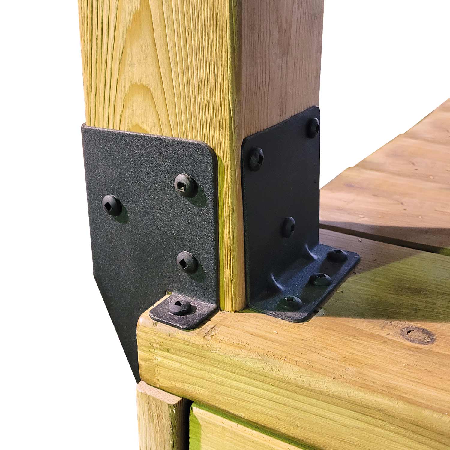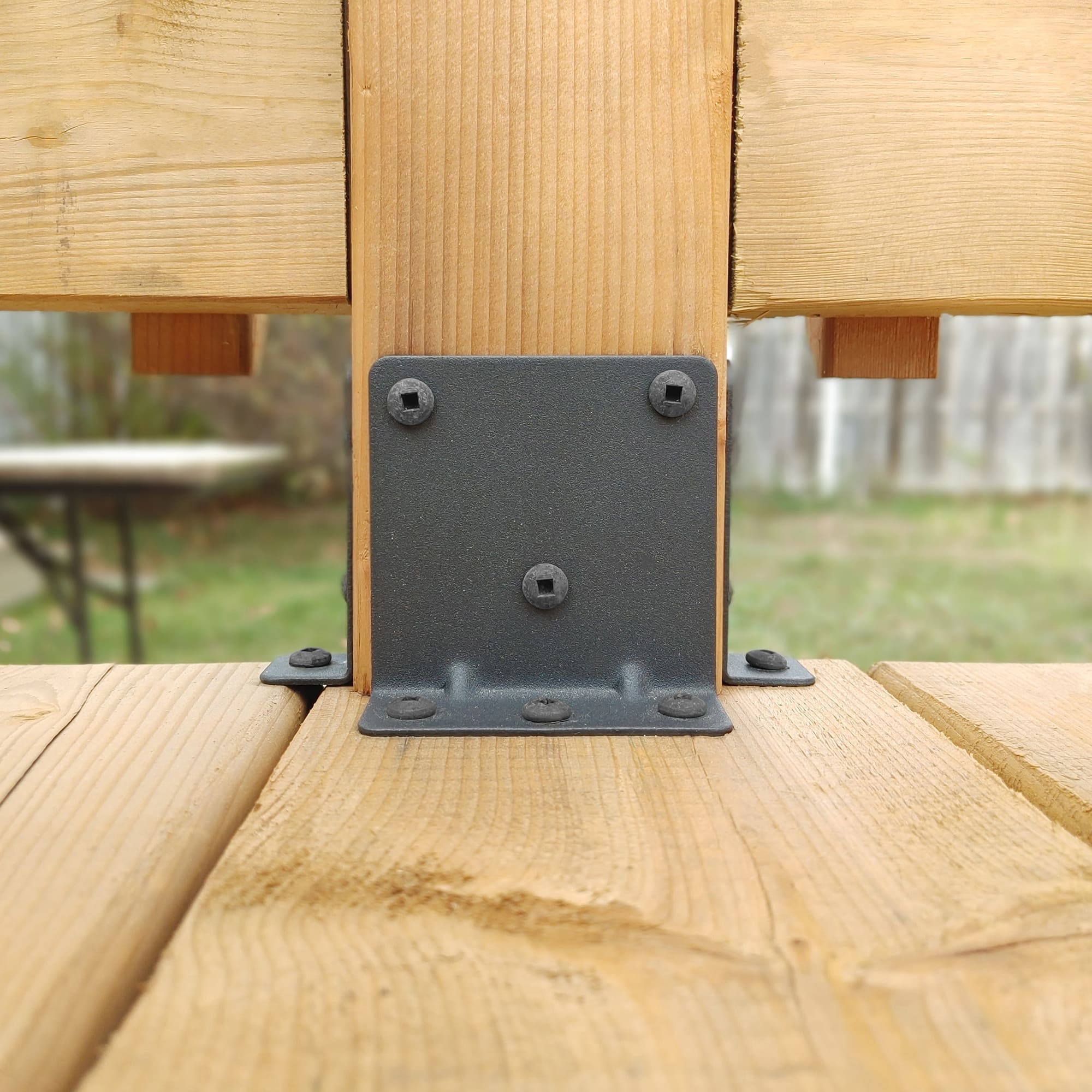 Ce produit sert à fixer les poteaux de rampe au patio. La superficie libre du plancher est augmentée, puisque les poteaux sont fixés aux extrémités du patio.